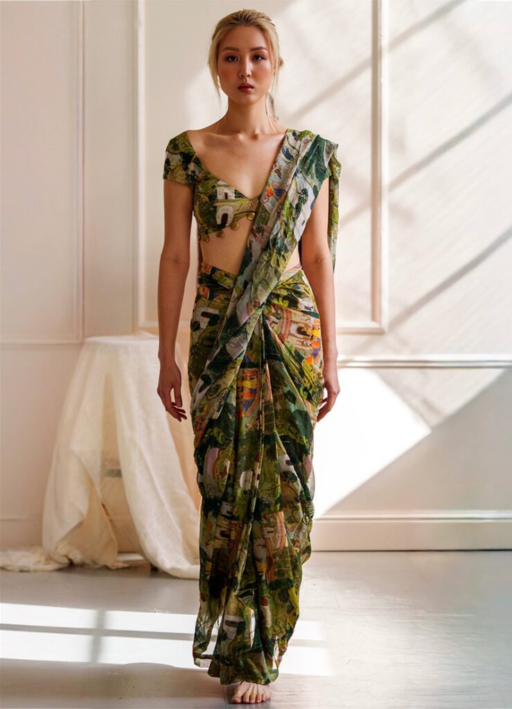 Called an “ode to age-old arts from the Indian subcontinent,” Shiro Mani brought traditional Indian garments with a fresh modern aesthetic to shows during Paris Fashion Week. The show, themed on fresh laundry, featured a sheet above the runway, blowing in the wind, representing linen drying, childhood, and nostalgia. Each garment presented by a woman walking barefoot made its debut under this sheet, unveiling a modern take on traditional Indian-wear and artistry.